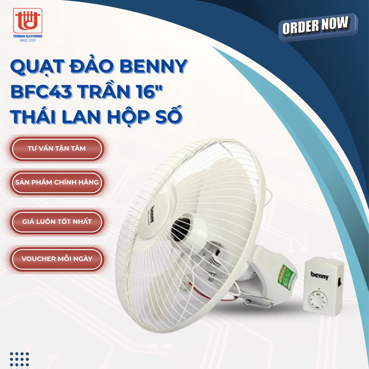 Quạt đảo trần Benny BFC-43 chính xác là một sự chọn tuyệt vời cho bạn để khắc phục tất cả những bất cập trên. Quạt đảo trần Benny BF-C43 có kích thước nhỏ, tiết kiệm không gian, khả năng tản gió tốt, quay 360 độ linh hoạt và đa dạng tốc độ gió.