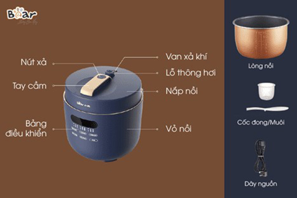 Nồi áp suất điện đa năng Bear A50M1 bao gồm các bộ phận như thân nồi, lòng nồi, cốc đong, muôi, dây nguồn. Trên thân nồi là gồm có nút xả, van xả khí, lỗ thông hơi, tay cầm, nắp nồi, vỏ nồi và bảng điều khiển.