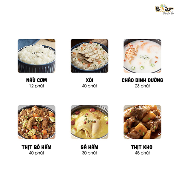Với 9 chức năng nấu khác nhau, bạn có thể thỏa sức sáng tạo trong chính căn bếp của mình thông qua việc nấu cơm, xôi, cháo, thịt hầm, gà hầm, thịt khó,…chỉ bằng một chiếc nồi áp suất đa năng. Ngoài các chức năng cơ bản, nồi áp suất điện đa năng Bear YLB-A50M1 còn có các chức năng hẹn giờ linh hoạt đến 24 tiếng, giữ ấm thức ăn rất tốt. Với Bear, việc nấu ăn trở nên đơn giản, tiện lợi, tiết kiệm thời gian cũng như chất lượng dinh dưỡng của món ăn vẫn được giữ nguyên, mang đến cho bạn và cả gia đình những bữa ăn đậm vị.