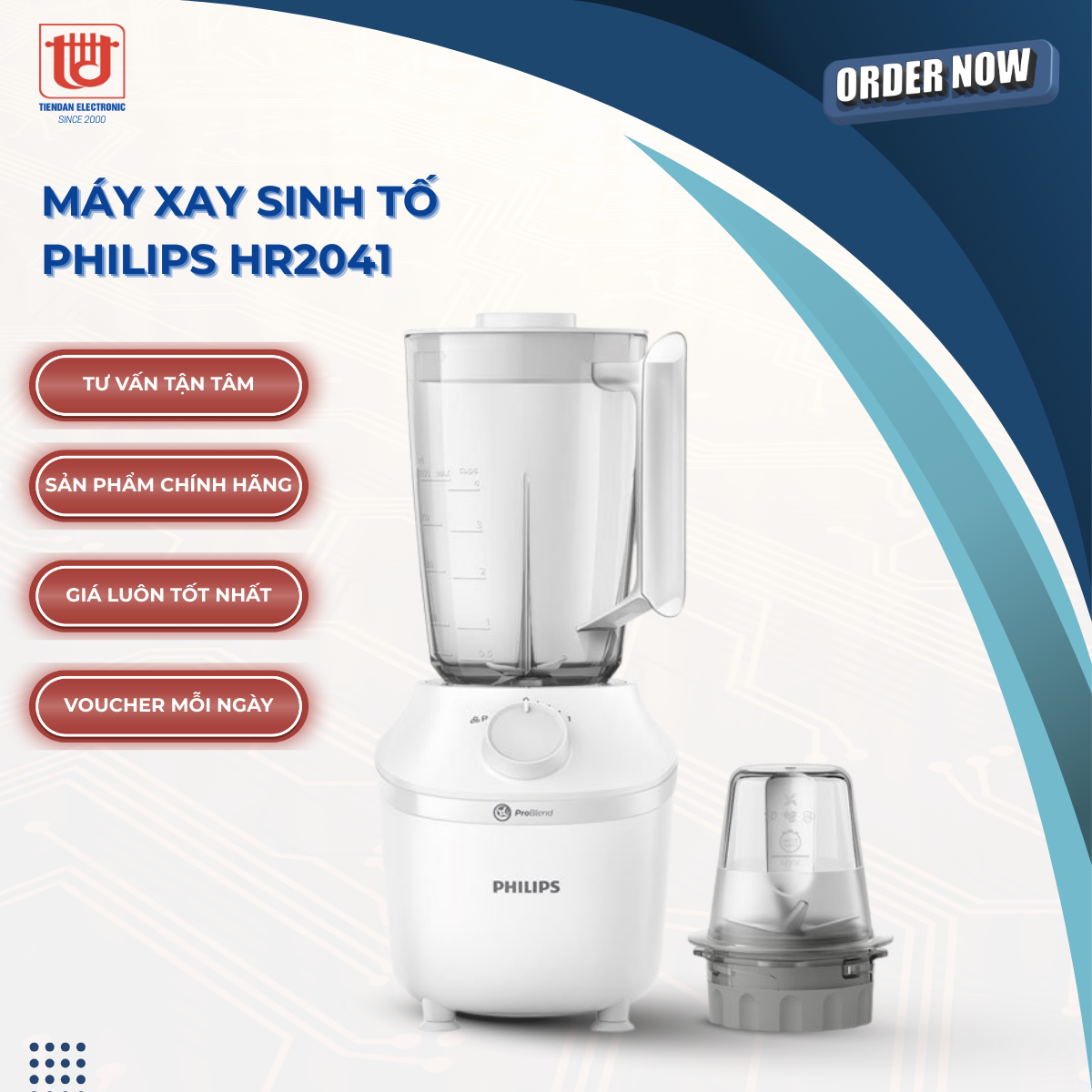 Máy xay sinh tố Philips HR2041/10 thiết kế nhã nhặn, kiểu dáng hiện đại, công suất lớn cùng công nghệ ProBlend hỗ trợ xay đá viên tiện lợi, đáp ứng tốt nhu cầu sử dụng cá nhân hoặc gia đình.