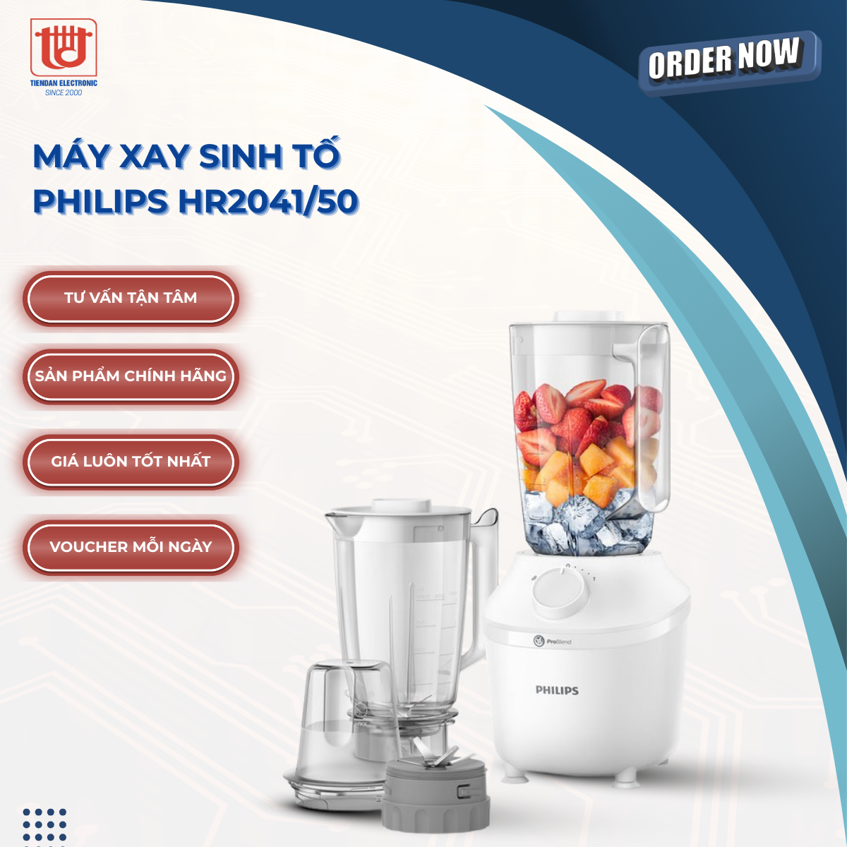Máy xay sinh tố Philips HR2041/50 màu sắc nhã nhặn, kiểu dáng hiện đại, công suất lớn cùng công nghệ ProBlend hỗ trợ xay đá viên tiện lợi, 2 cối xay lớn đáp ứng tốt nhu cầu sử dụng cá nhân hoặc gia đình.