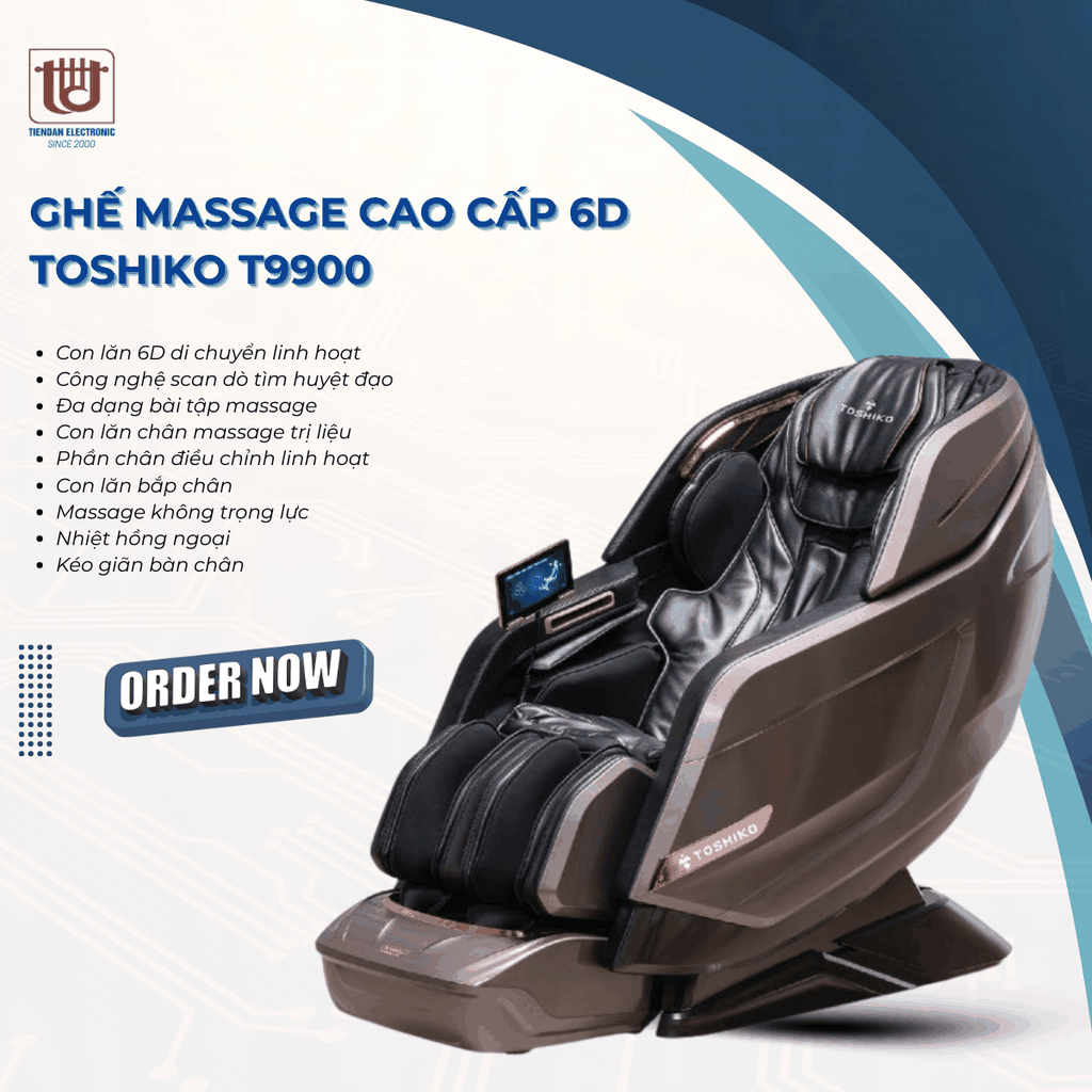 Ghế massage Toshiko T9900 là sản phẩm ghế massage thuộc phân khúc cao cấp với nhiều điểm ưu việt vượt trội. Sở hữu thiết kế tinh tế với sắc đen sang trọng, cùng những công nghệ massage bậc nhất như con lăn 6D, tổ hợp massage chân, scanbody dò tìm huyệt đạo,... T9900 đem đến cho người dùng những trải nghiệm massage đỉnh cao, chăm sóc toàn diện cho sức khỏe người dùng, bao gồm cả sức khỏe thể chất và tinh thần. Có thể nói, T9900 là thiết bị chăm sóc tại nhà mà bất cứ ai cũng nên cân nhắc.